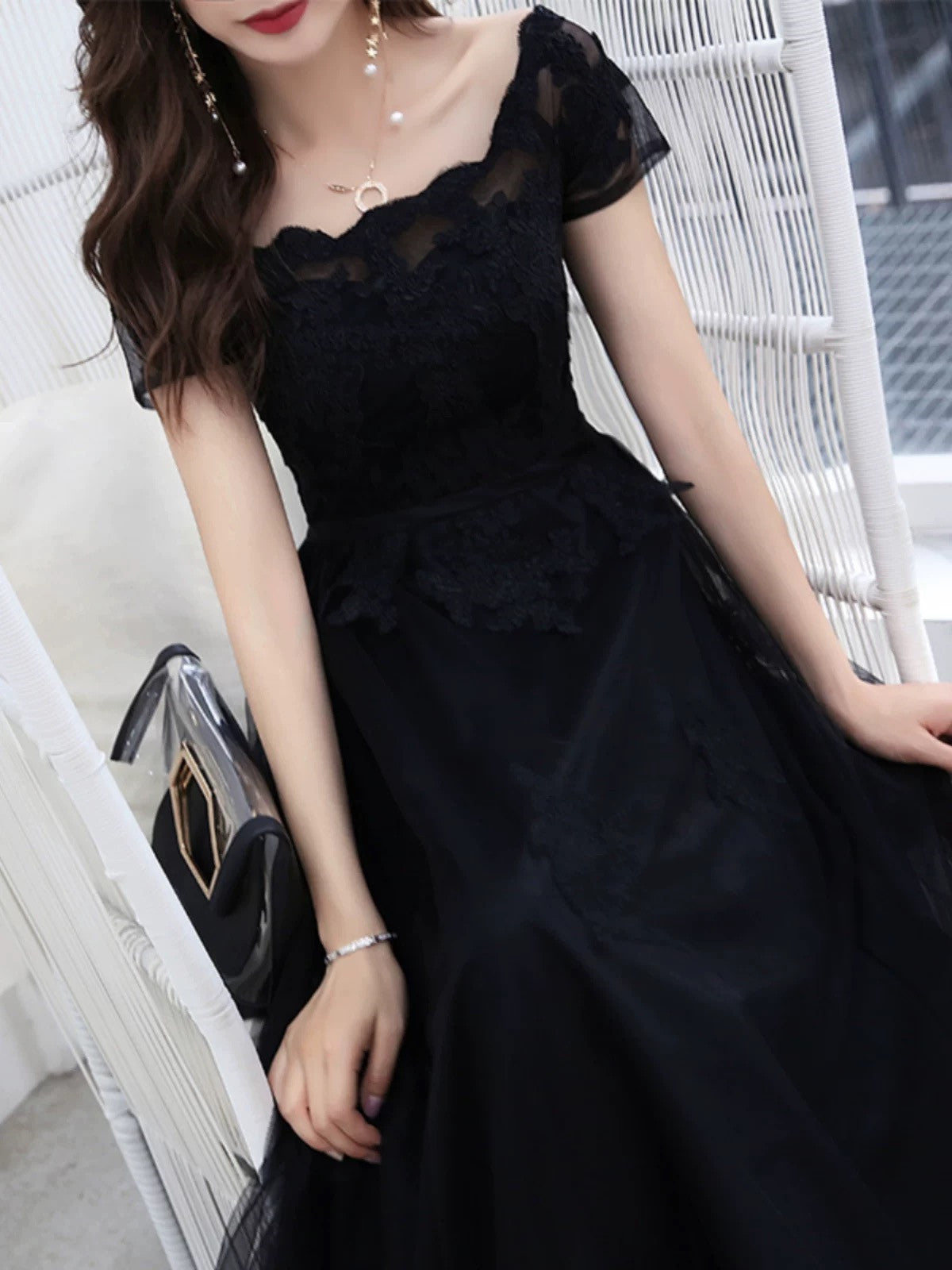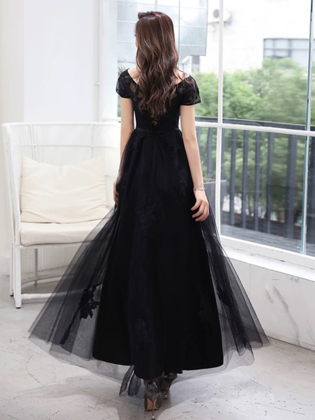Black A-line Tulle with Lace Applique Party Dress, Black Short Sleeves Long Prom Dress