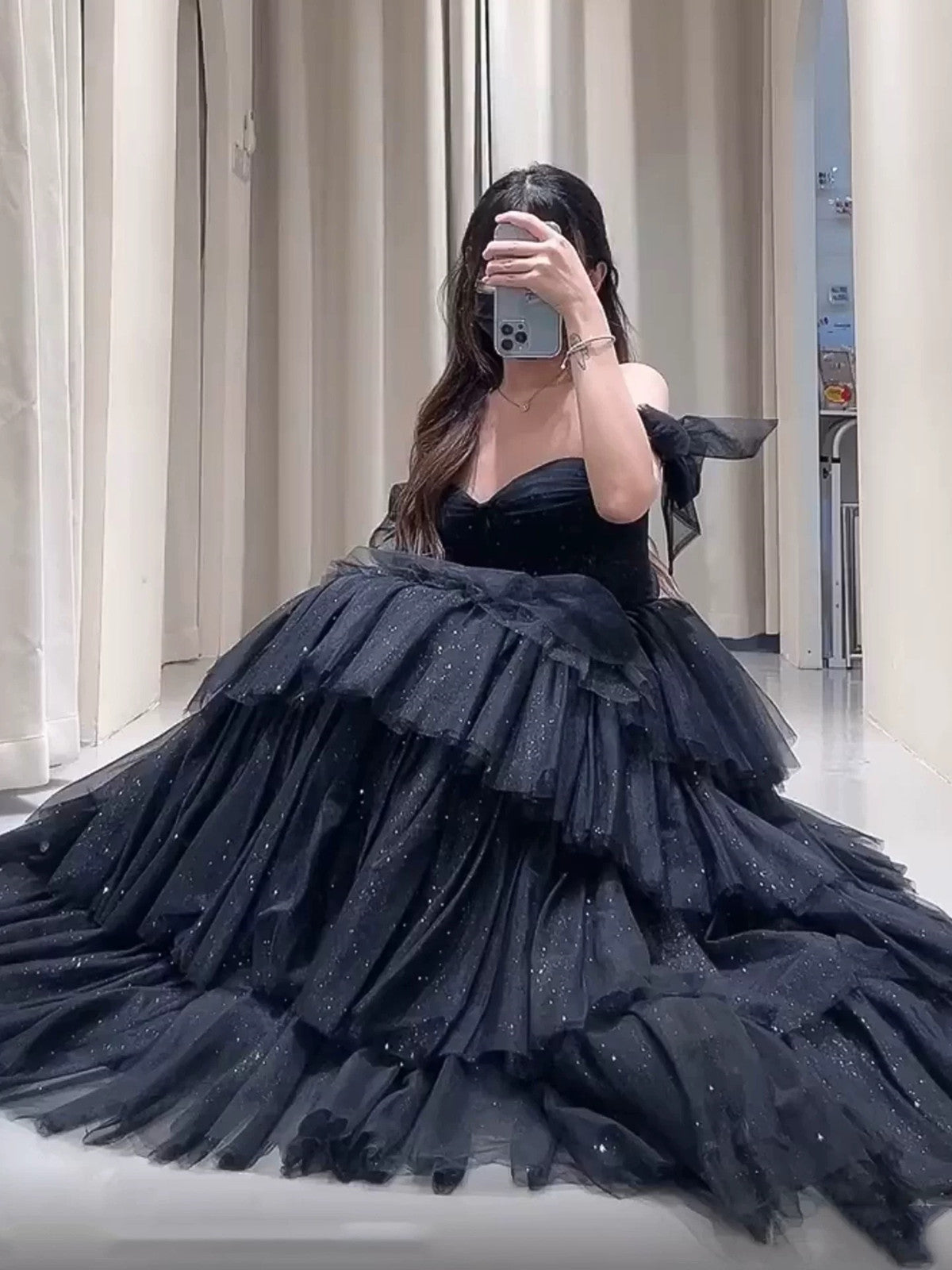 Black Tulle Sweetheart Layers Long Party Dress, Black A-line Tulle Evening Dress Prom Dress