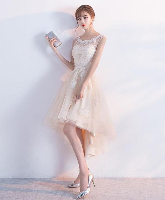 Champagne Lace Round Neckline High Low Tulle Formal Dress, Cute Party Dresses