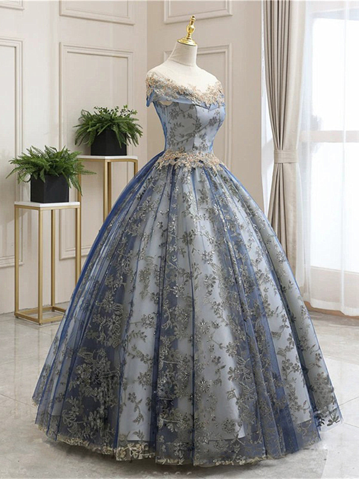 Charming Blue Tulle with Lace Cap Sleeves Party Dress, Tulle Ball Gown Sweet 16 Dress