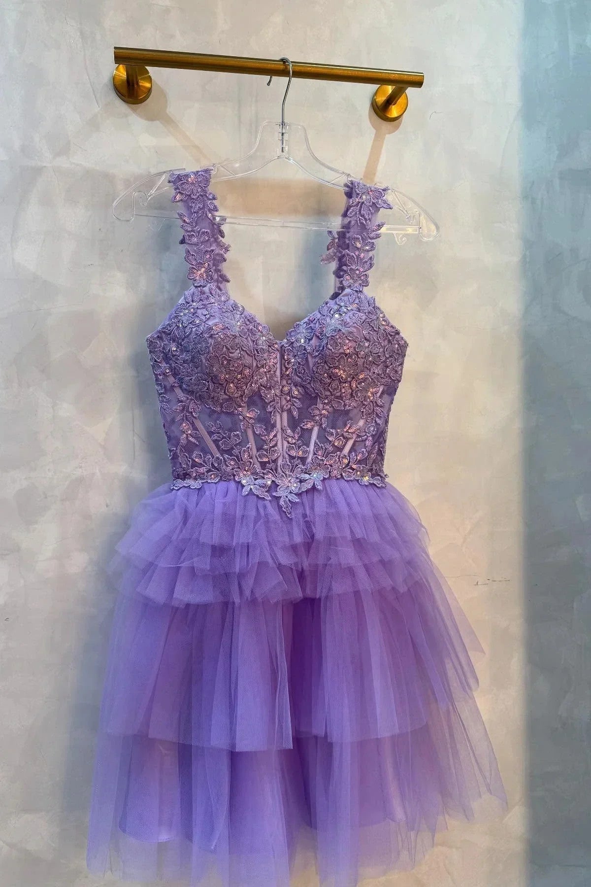 Cute Purple Sweetheart with Lace Applique Party Dress, Cute Short Tulle Homecoming Dress
