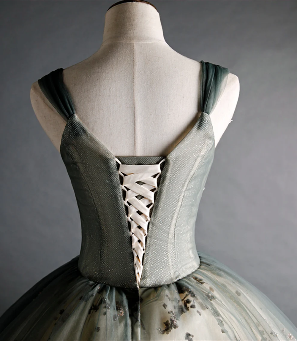 Dusty Green Ball Gown Beaded Tulle Formal Dress, Ball Gown Sweet 16 Dresses