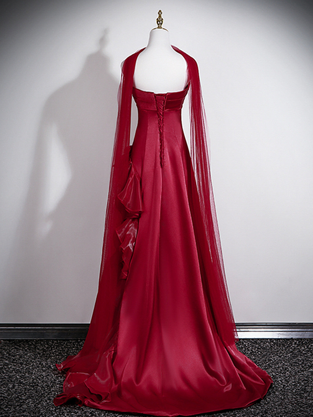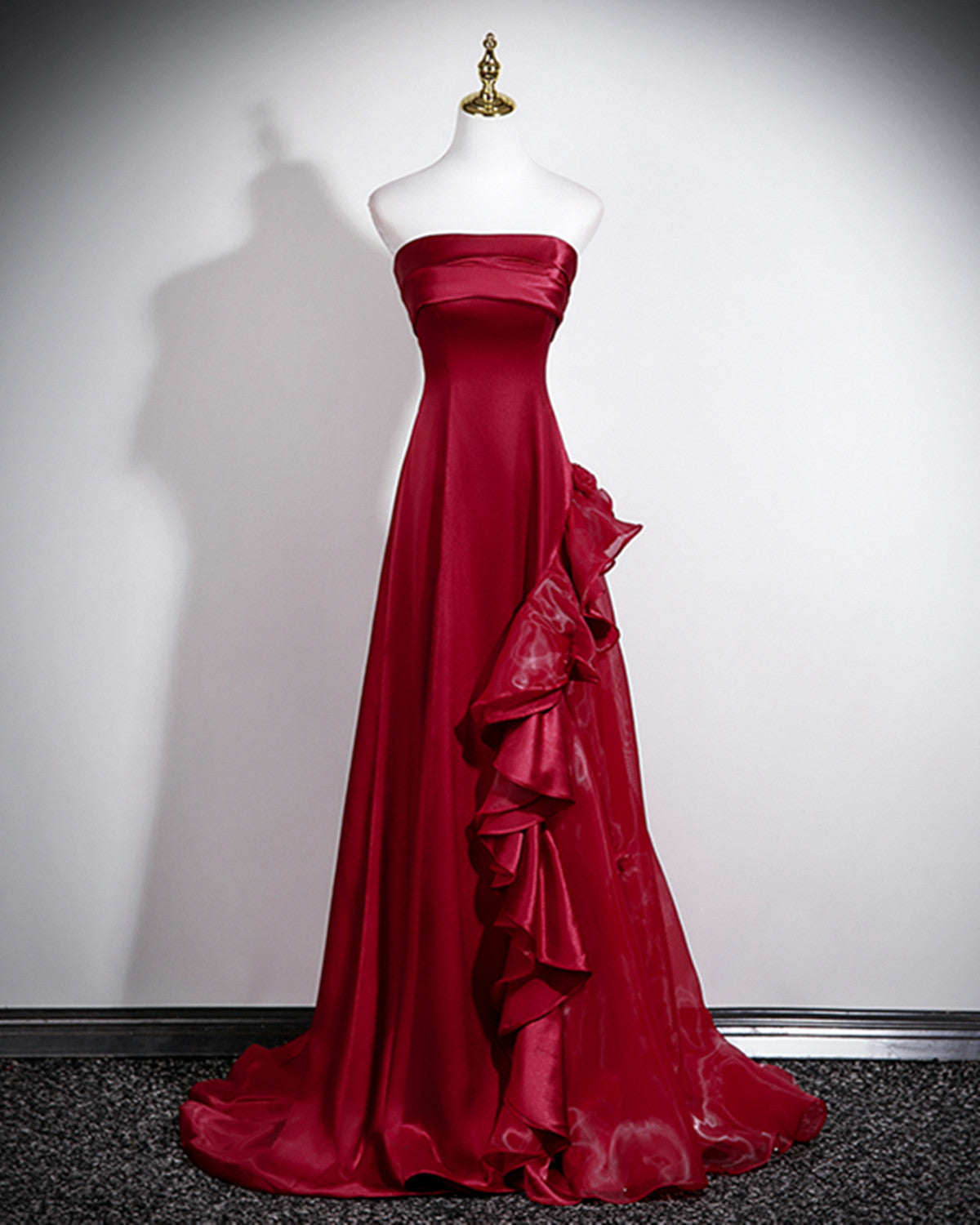 Elegant Strapless Wine Red Evening Gown with Organza Skirt, Wine Red Satin A-line Prom Dress