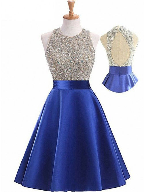 Fashion Knee-Length Open Back Satin Homecoming Dress with Beading, Short Party Dress