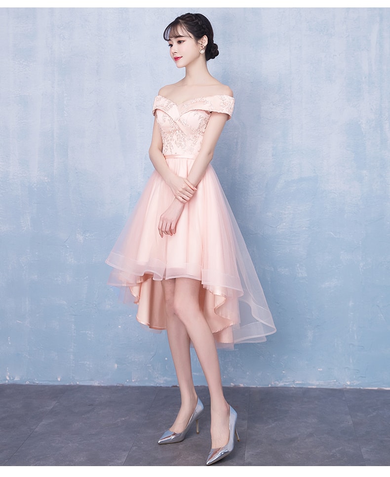 pink off shoulder tulle high low dress