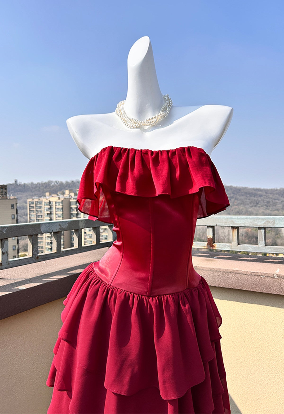 Wine Red Chiffon Layers Strapless Long Party Dress, A-line Wine Red Chiffon Prom Dress