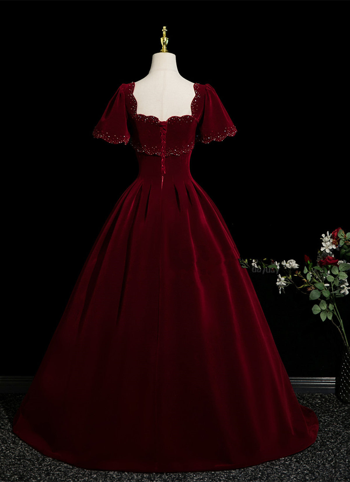 Wine Red Velvet Short Sleeves A-line Prom Dress, Wine Red Velvet Long Evening Dress